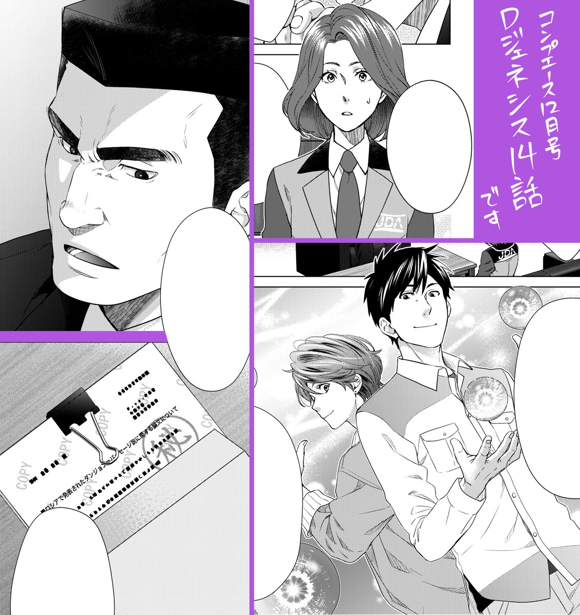 10/26発売のコンプエース12月号に『Dジェネシス ダンジョンが出来て3年』第14話載ってます。単行本のページ調整のため今回は短めです(つまりこの回まで2巻に入ります) ある機密文書を前にJDAで何やら動きが…?という回です。