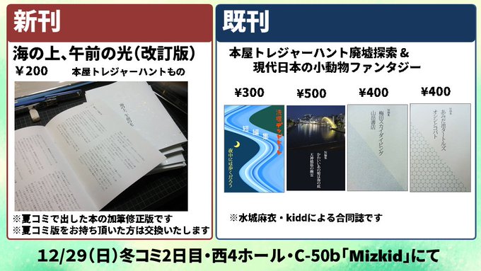【冬コミ告知】冬コミのお品書き画像です。本のあらすじ紹介やサンプルPDFをコミケWebカタログでご覧ください。 #C97 #コミケ #コミケ97 #創作文芸 #C97WebCatalog webcatalog.circle.ms/Perma/Circle/1…