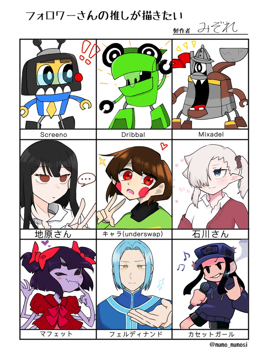 # フォロワーさんの推しが描きたい リクありがとうございましたァ…そしてすみませんでしたァ…… 初描きのキャラばっかなんでデザミスってても許して🙏