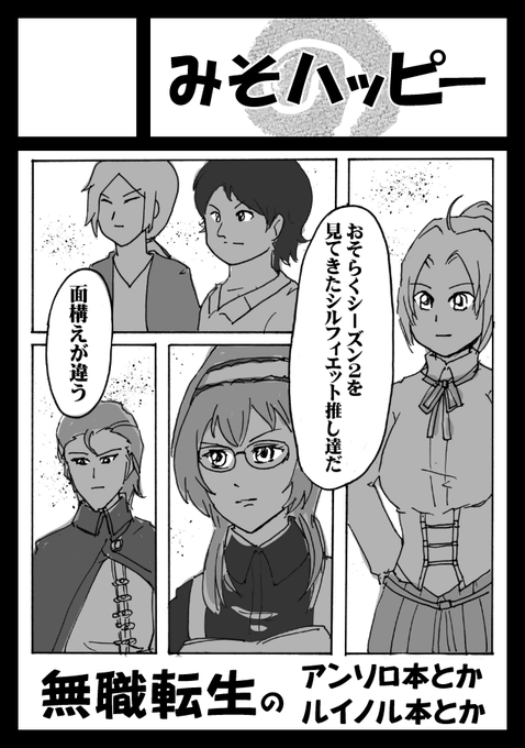 サークルカット載せてなかった…。 アンソロ本とほぼルイノル本状態のジェルドさん本と、あと無職転生と異世界おじさんとのダブルパロ本がきっとあるはず!(ジェルドさん本既刊だったら…すいません(弱気)) 金曜日 東 ペ 32bです! みそハッピー webcatalog-free.circle.ms/m/Circle/16803… #C101WebCatalog