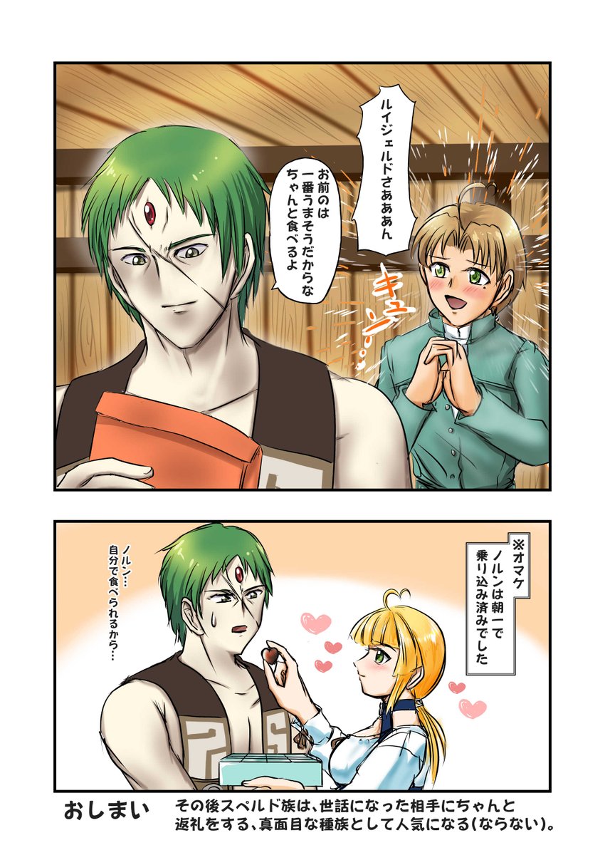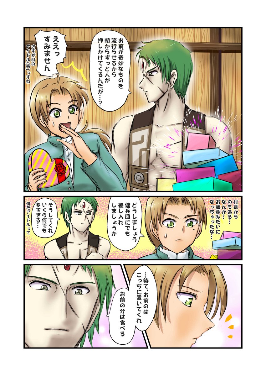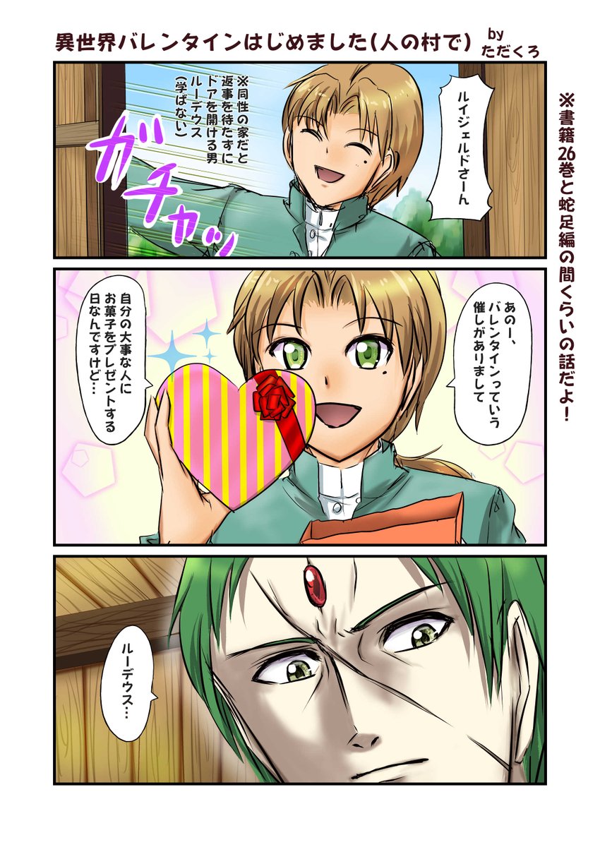 ハッピーバレンタイン!(遅刻 去年のバレンタインに描いてたのを、一年越しで描き上げました… 書籍26巻の後で蛇足編の前くらいの話です。 ルイジェルドさんにチョコを…チョコを貰ってほしいんじゃああ…! #無職転生FA #Mushokutensei