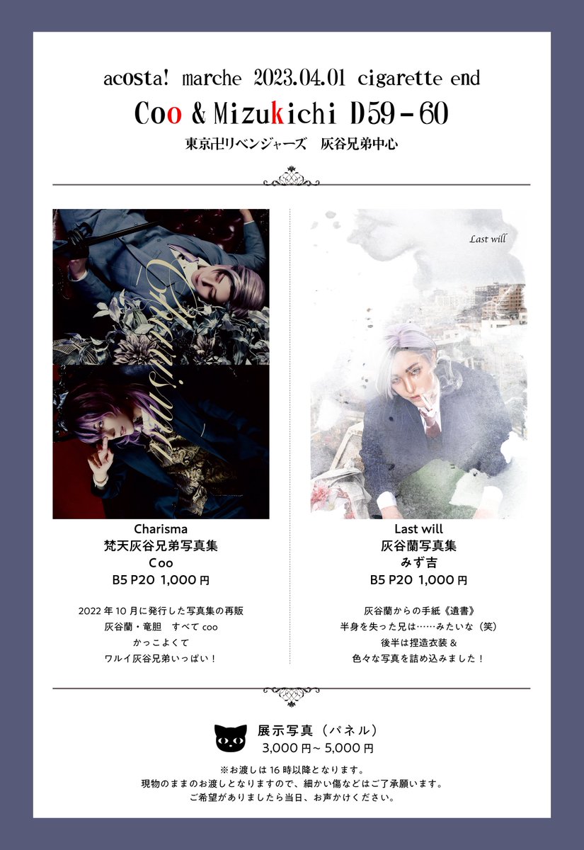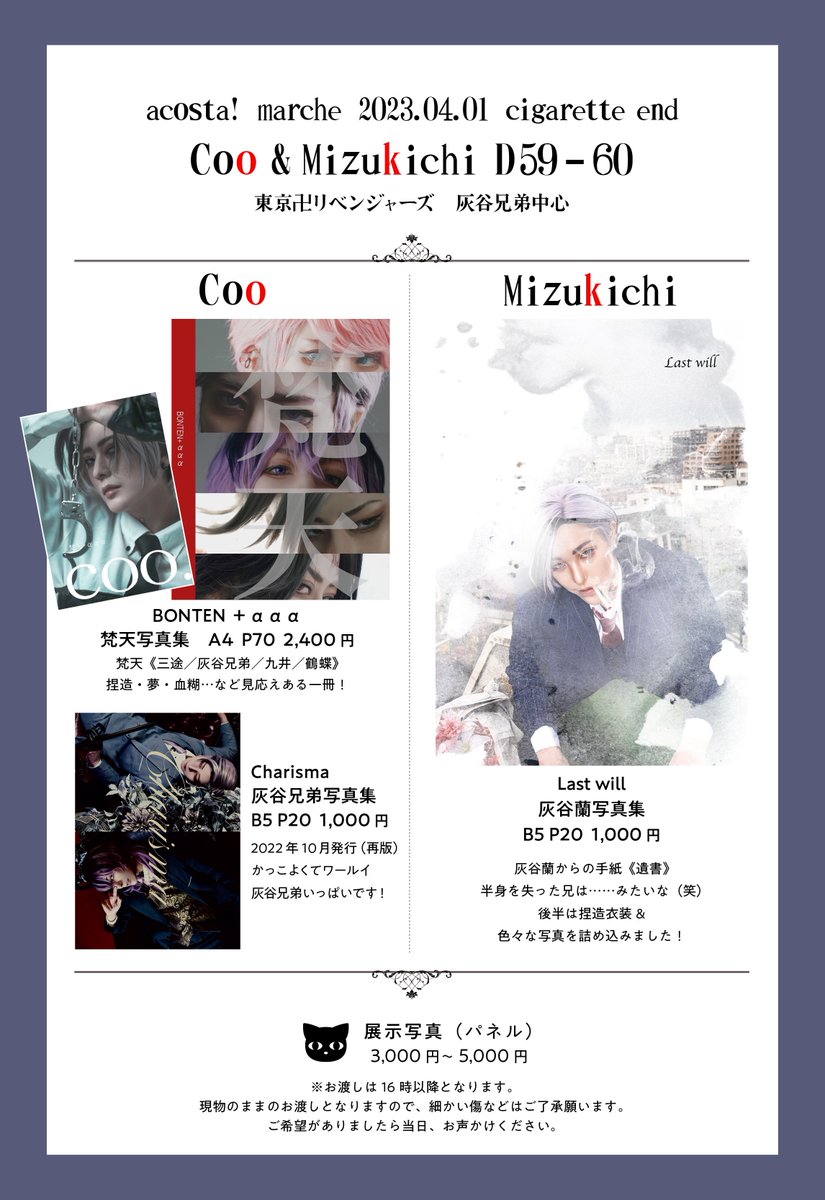 チェキ📸撮影スケジュールです🌸 兄弟撮影 13:30〜14:30 16:00〜16:30 cooさん(@coo_07_vivi )スペ在中時は都度OKとなります❣️ 朱音さん(@akkkanee001 )撮影パネルの迫力間近でご覧頂きたい❣️ 宜しくお願いします✨✨ #アコスタマルシェ #アコスタ池袋 #Uアコスタ2023