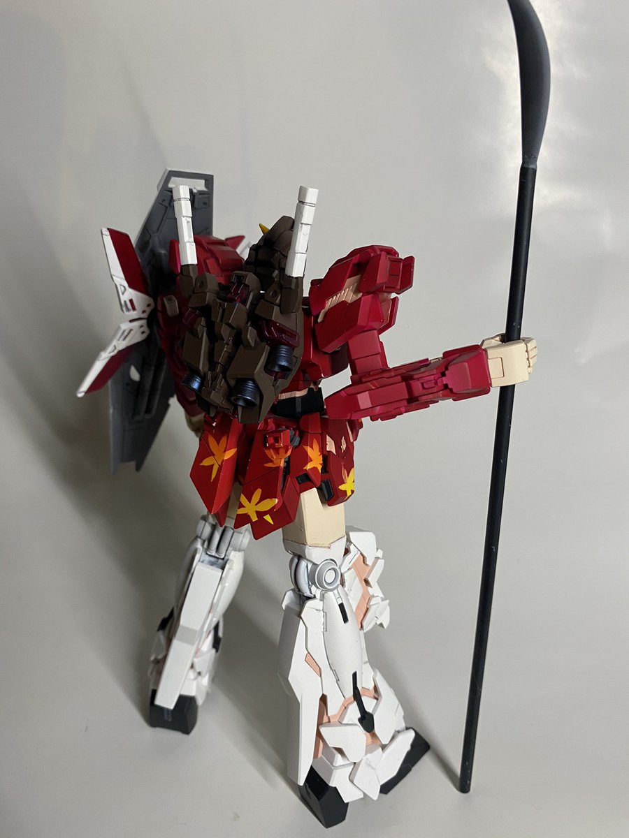 オニコーンガンダム完成。懸案だった紅葉柄迷彩とあざまるマークも、やってみたら以外となんとかなったっぽい。やり直す気力は残ってなかった。 でも、やりたい事は出来たから満足! #V鬼子