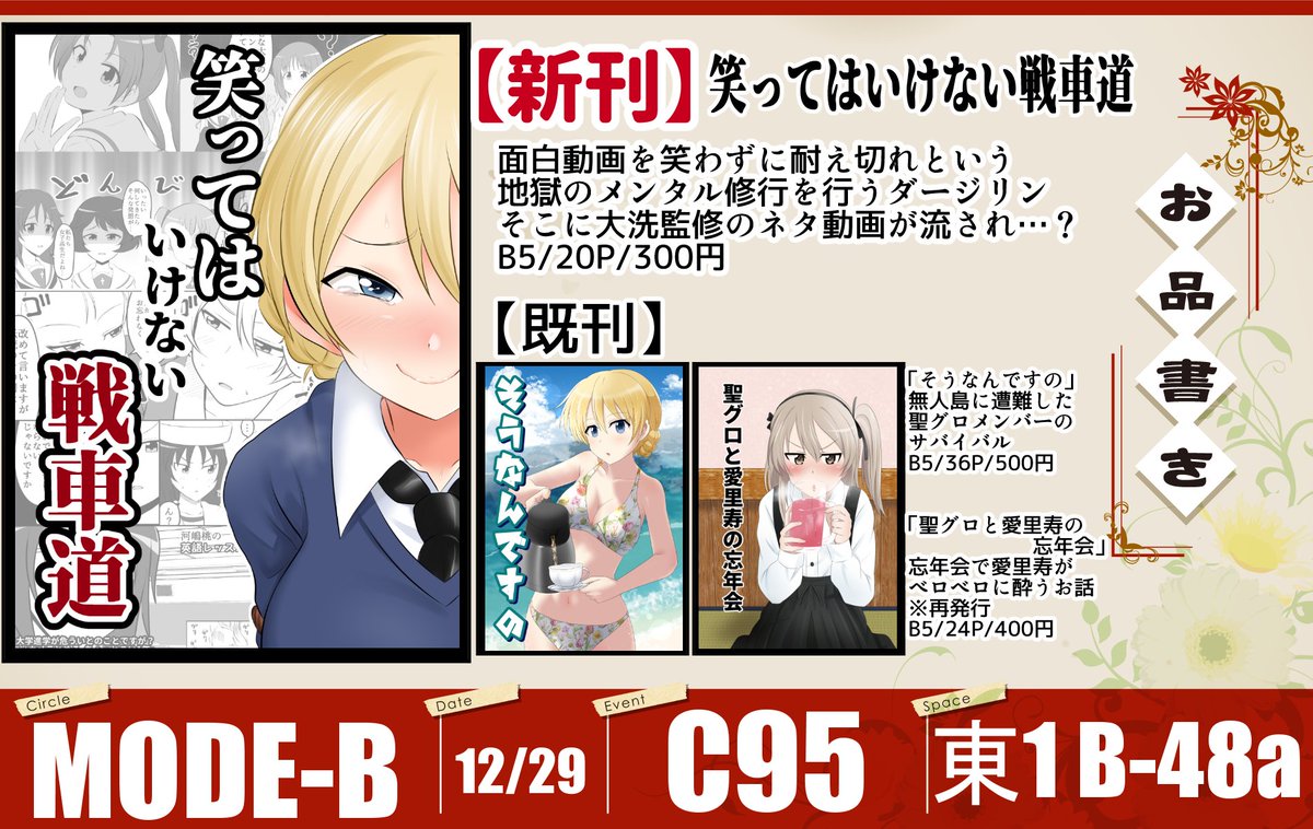 冬コミ1日目東B48a『MODE-B』のおしながきです! 去年の冬に出した愛里寿ちゃんの忘年会本も少部数再版して持って行きます! 当日はよろしくお願い致します!