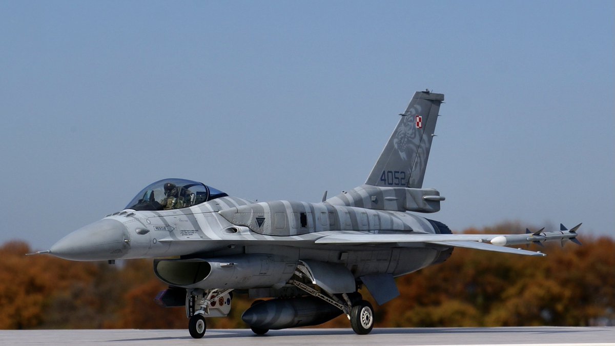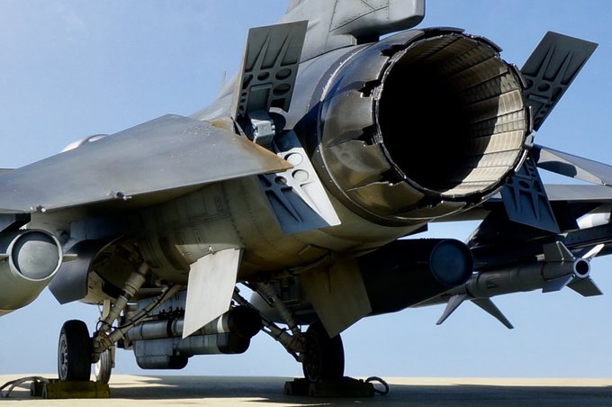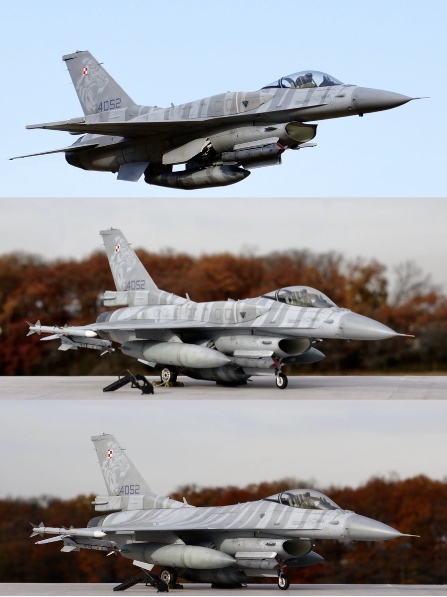 F-16C_Block52+(1/32)ポーランド空軍 屋外撮影してようやく完結。 差し替えで飛行・駐機再現可能。 今回は脚を折り畳む途中に挑戦してみました。やりたかったトラ柄の機体を寅年の間に完成できて感無量です。 (タグに感謝☺️) #TwitterTigerMeet2022 #TTM2022 #16トラ