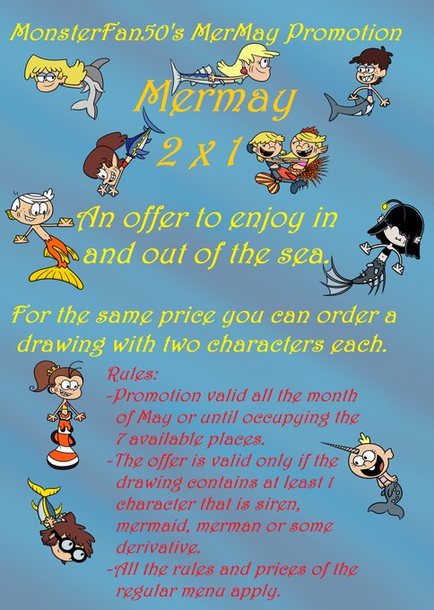 MerMay's promotion. For the same price you can order a drawing with two characters each. My Menu MF50: twitter.com/MonsterFan50/s… #mermay #mermay2021 #Commission