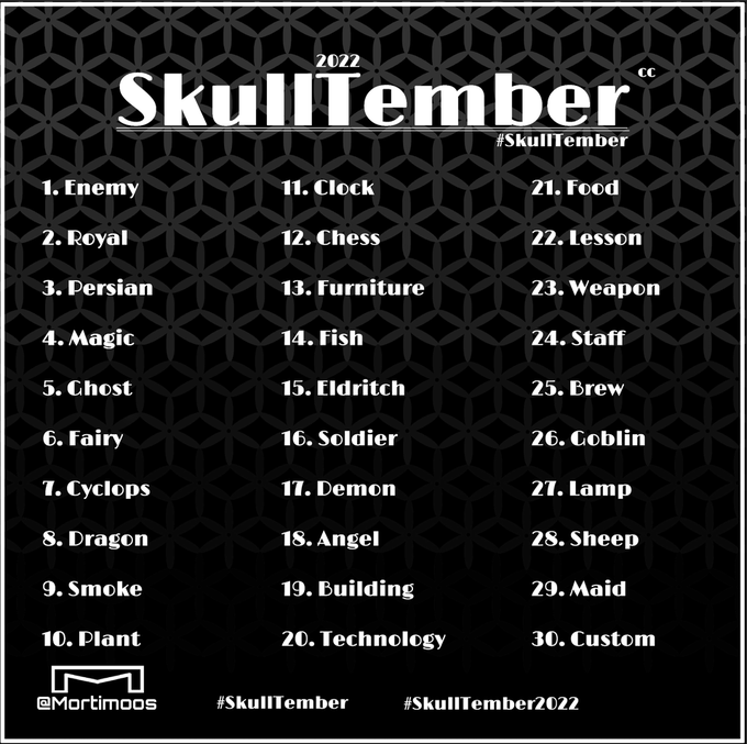I am launching 💀 #Skulltember! 💀 This works much like #Inktober and #Mermay, where you use one of the prompts and draw something themed! Let's get ready for spooktober with some spooky skulls!! 🤜🤛