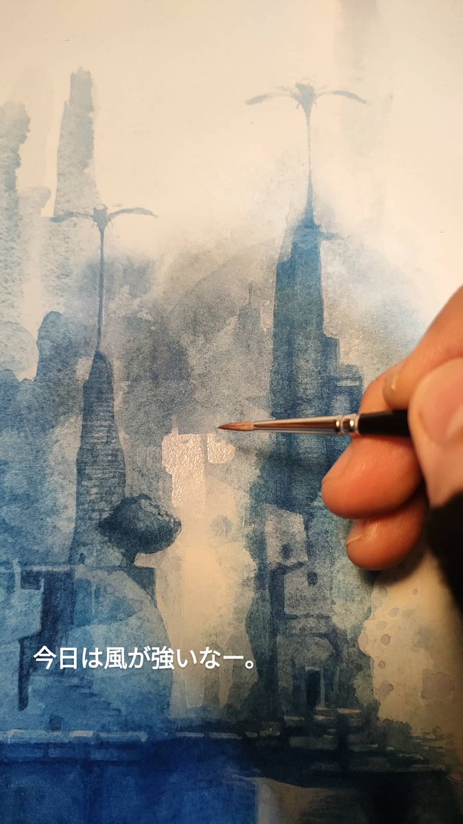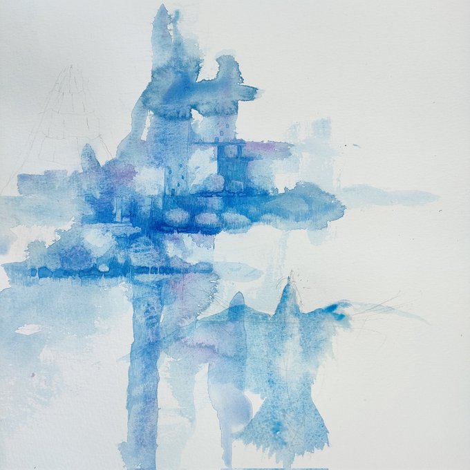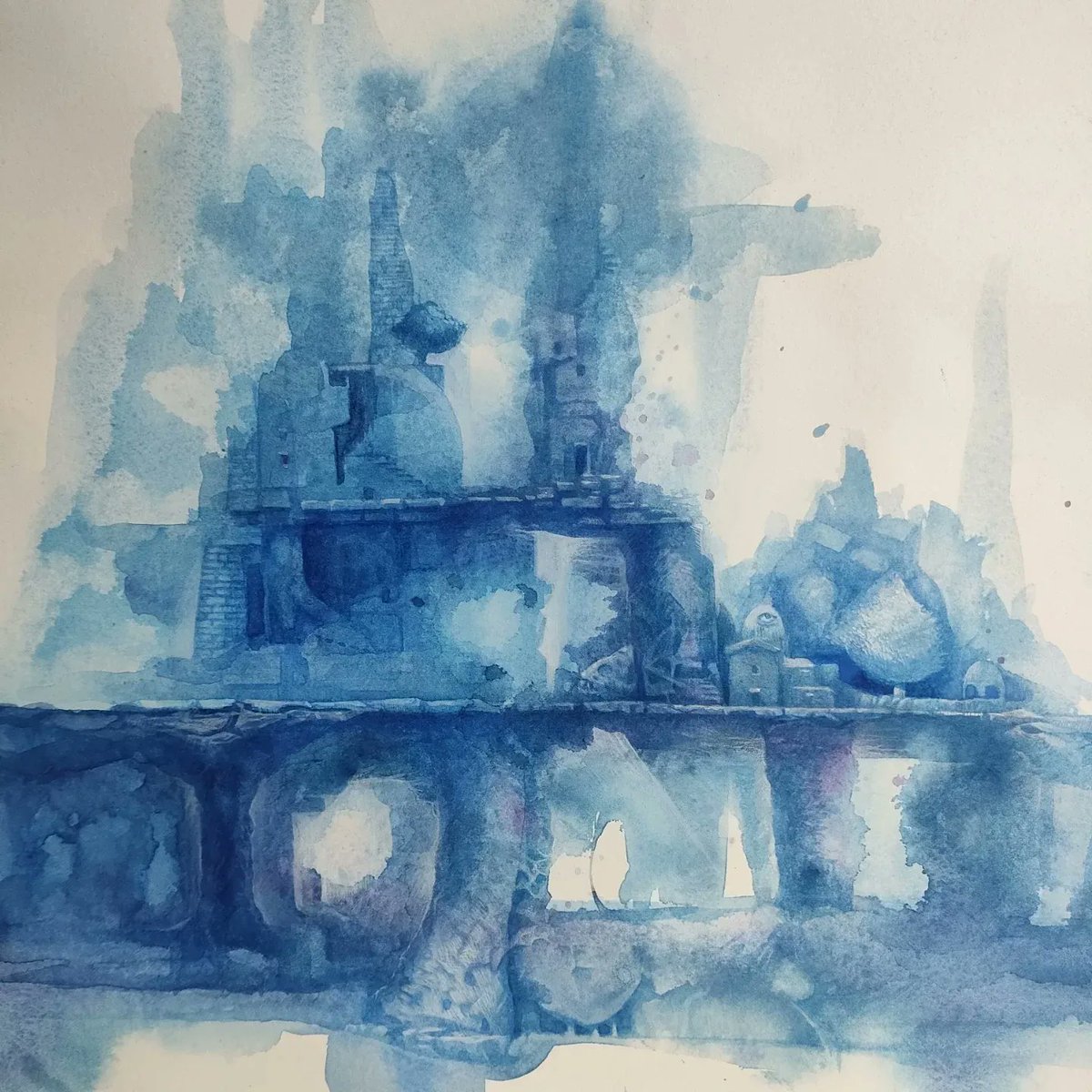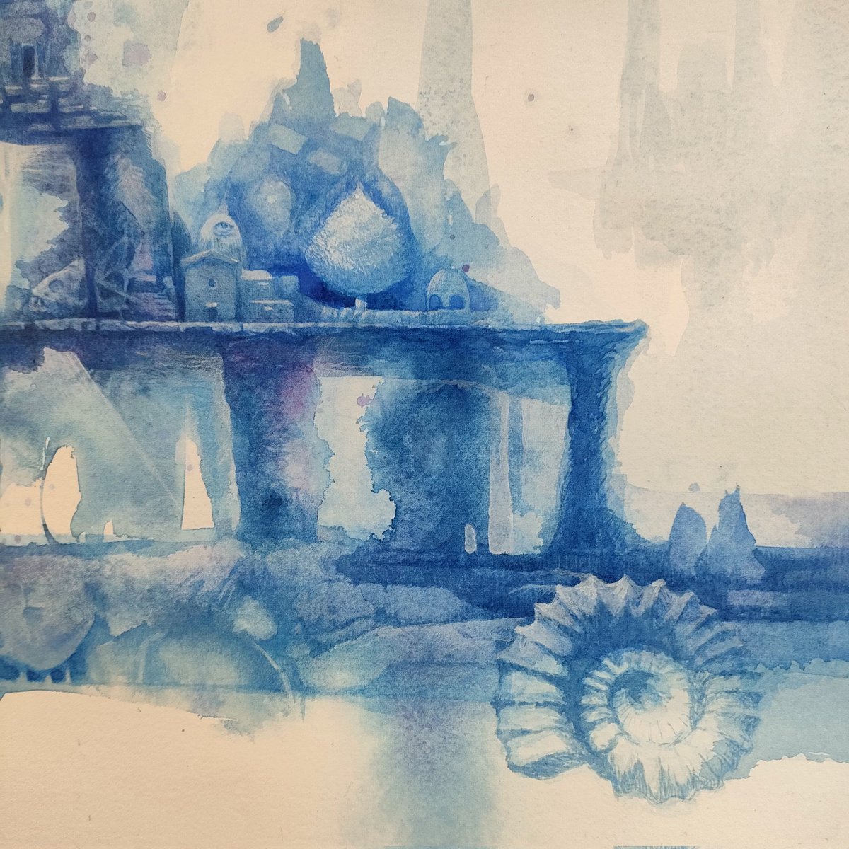 青い絵の具で遺跡のような物を描いています。いろんなものが画面の中に隠れています。最近は登山も始めて、巨岩を眺めたり鉱物採集したりしています。#art #透明水彩 #watercolor #blue #イラスト #illustration