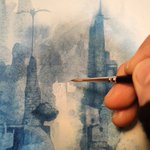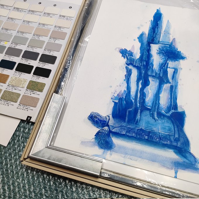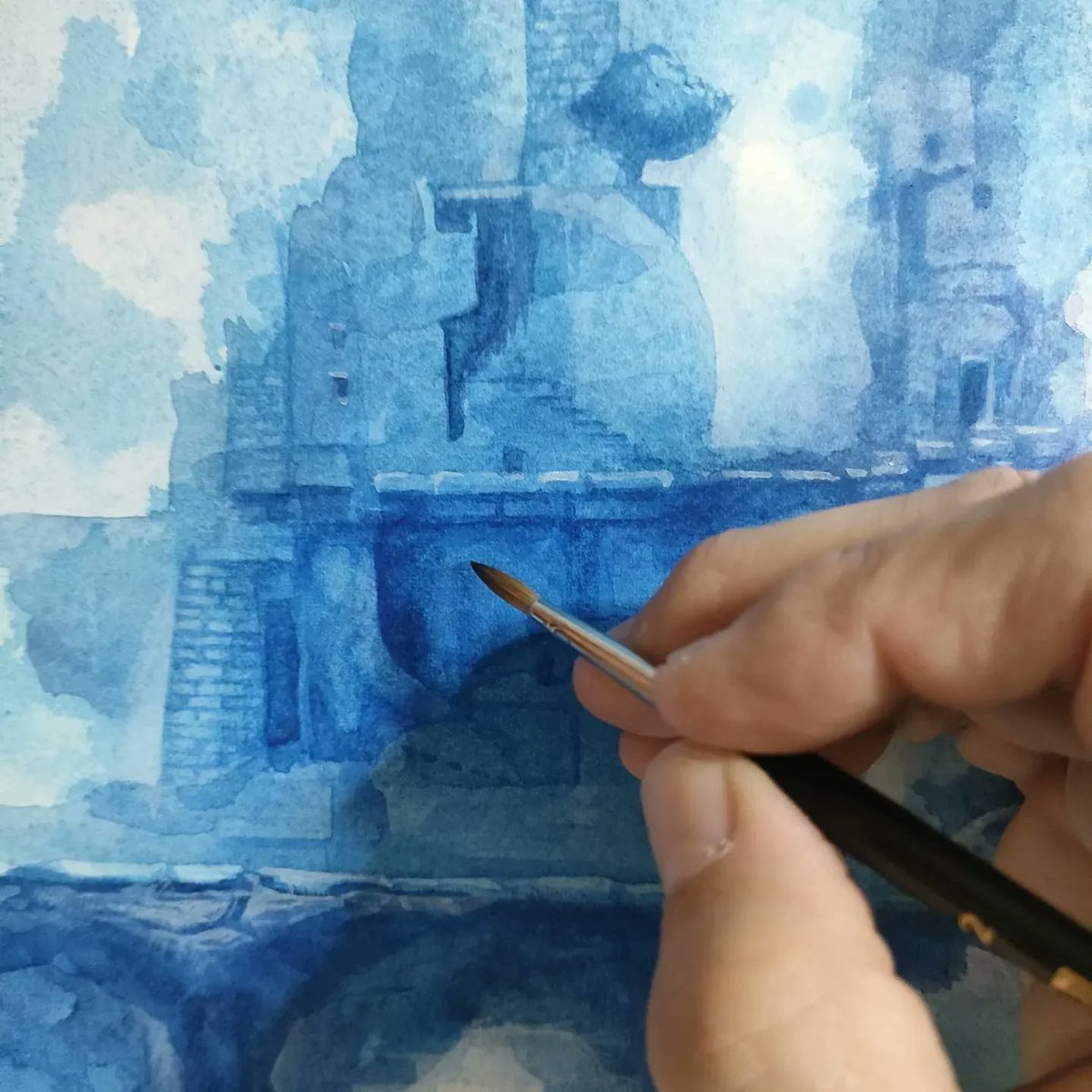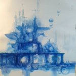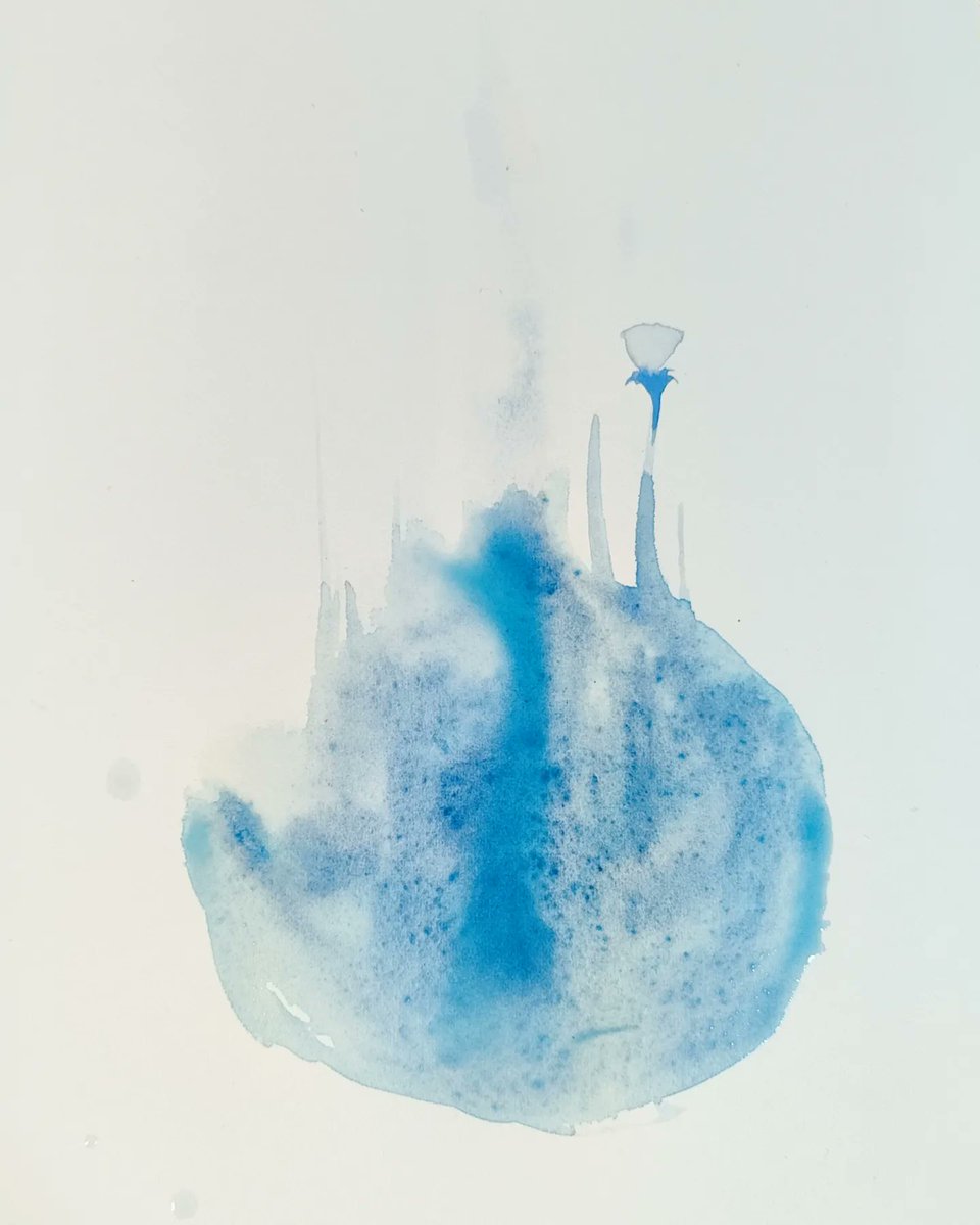 青い絵の具で遺跡のような物を描いています。いろんなものが画面の中に隠れています。最近は登山も始めて、巨岩を眺めたり鉱物採集したりしています。#art #透明水彩 #watercolor #blue #イラスト #illustration