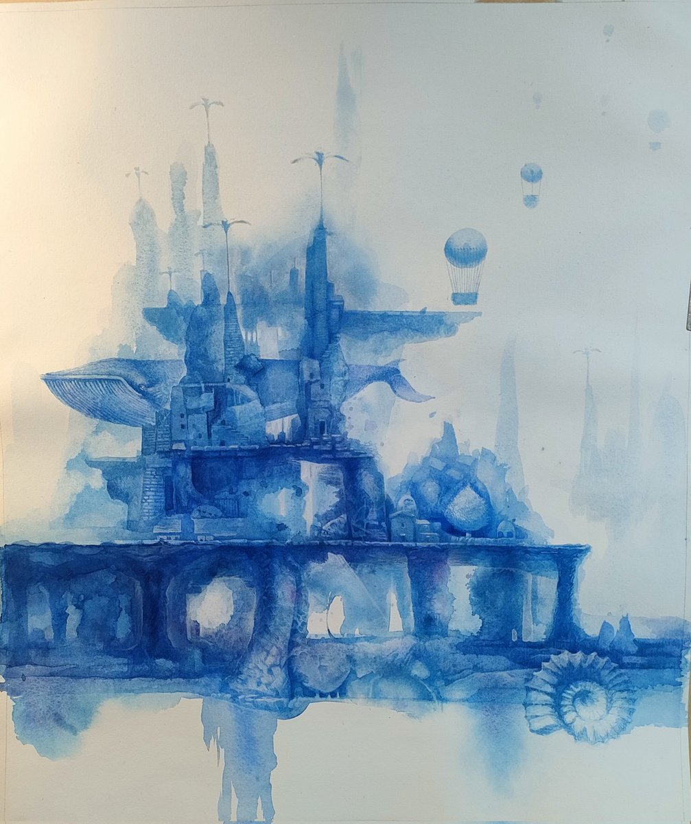 「Haven・安息の地」f6・紙 海にもいきたいな〜。クジラも見たい。制作中 #art #watercolor #青 #透明水彩 #blue #art #illustration #シュールリアリズム #surrealism #chrysalis #アンモナイト #ammonite #シーラカンス #coelacanth #クジラ #whale #シロナガスクジラ