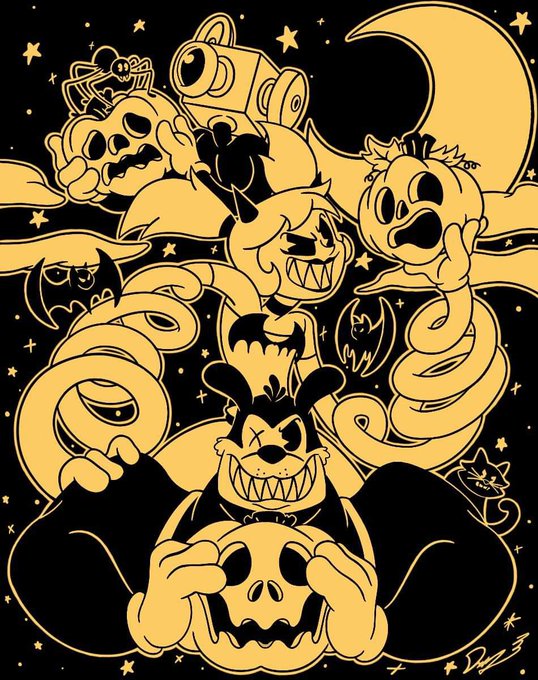 Day 15: Pumpkin #inktober I think it's time to break pumpkins in the light of night. This team will continue to do mischief this october. #bendyandtheinkmachine #bendy #inktoberday15 #drawing #ilustration #inktober2022 #pumpkin #halloween #thebrute #misstwisted #camaraman