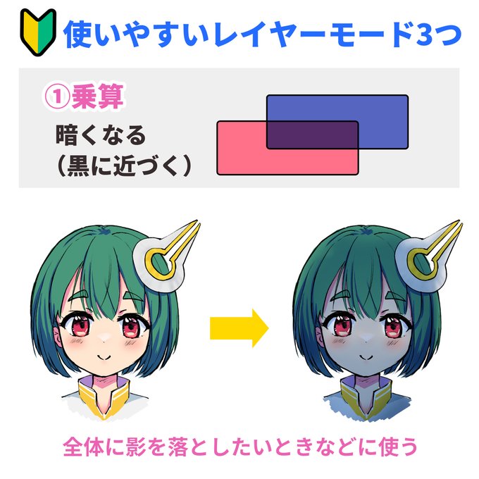レイヤーモード「乗算」「スクリーン」「オーバーレイ」の使い方かんたんまとめ。初心者はまずこの3つから覚えると良いと思います。 「レイヤーの合成モード多すぎて分からん」という人はご参考にどうぞ。 #イラスト練習 #パルミーお絵かきラボ