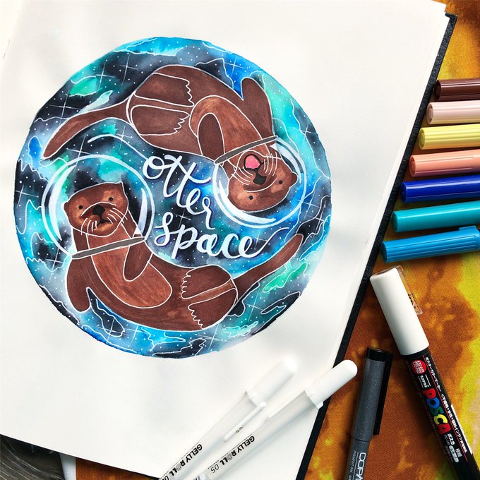 Spacetober Day 7! ✨I used the @tombowusa dual brush pens for the background and the tombow ABT pro markers for the otters. White details were done with white gelly roll pens and posca markers. Hope you all are enjoying my animal series! 💛✍🏻 #spacetober #inktober #InktoberDay7