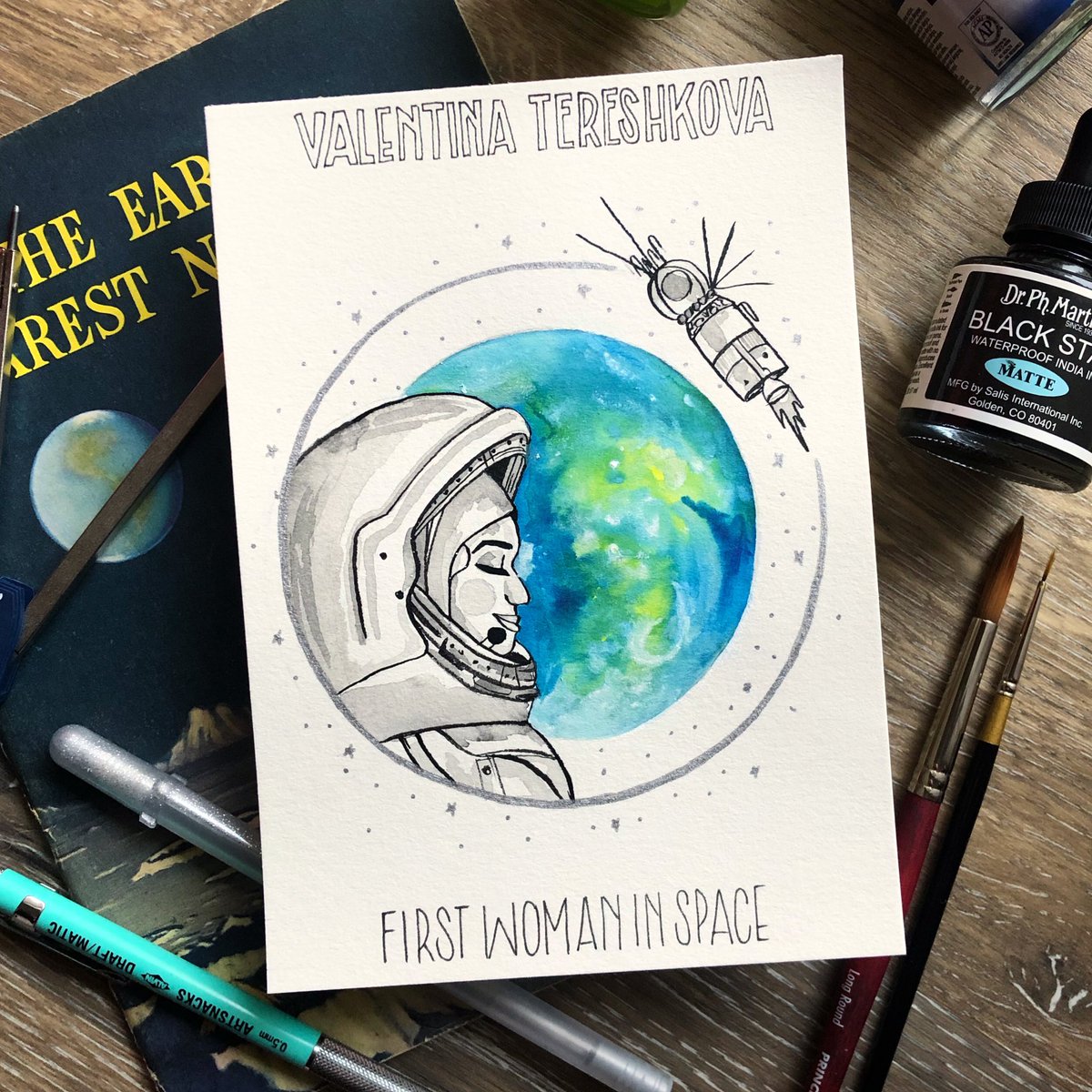 Spacetober Day 27✨Valentina Tereshkova - the first woman in space. She flew in 1963. Another woman would not fly into space for nearly 20 years. To this day, she remains the youngest woman to fly in space and the only woman to fly on a solo mission. #spacetober #inktober