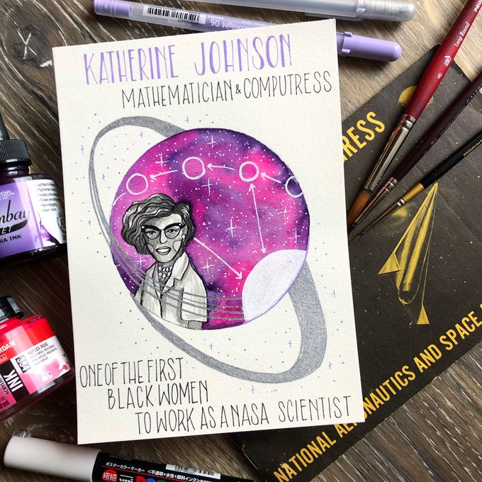Spacetober Day 28 ✨ Today I am highlighting mathematician Katherine Johnson. She was one of the first Black women to work as a NASA scientist, and the first woman at NASA to receive credit as an author of a research report💫 #spacetober #inktober #nasa #inktoberday28