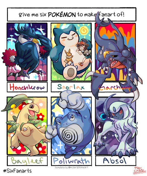 Finally finished! Thank you for everyone who has participated! 😁✨ #SixFanarts #Pokemon #honchkrow #snorlax #garchomp #bayleef #poliwrath #absol