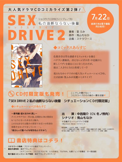 / 📕#セクドラ コミックス本日発売❗️✨ \ 『SEX DRIVE 2 私の油断ならない後輩』 (漫画:篁ふみ先生/ショコラブ) 🌟シチュCD付限定版も同時発売! ◉ステラワース→ stellaworth.co.jp/shop/item.php?… ◉アニメイト→ animate-onlineshop.jp/pn/pd/2093359/ よろしくお願いいたします🙇♂️✨