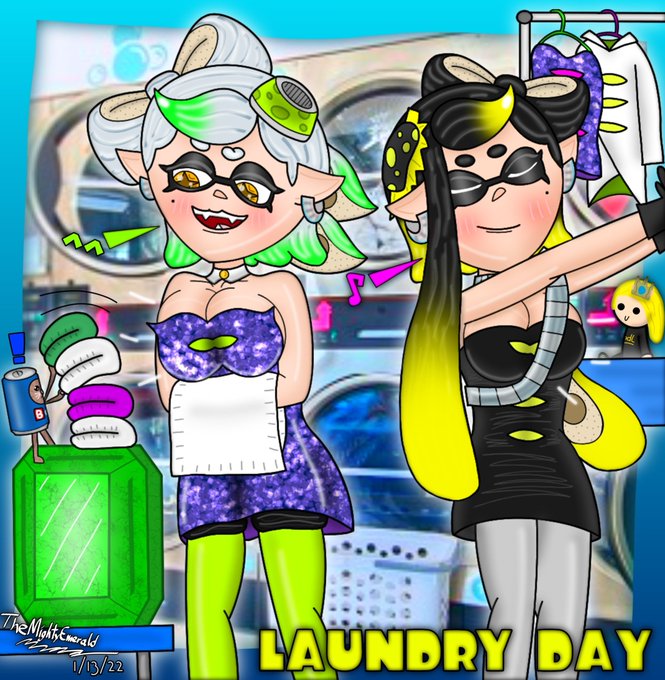 Squid Sisters Laundry Day 🥤💎💚💖 #splatoonart #squidsisters #Callie #Marie #fanart #ArtistOnTwitter #Splatoon #Splatoon3