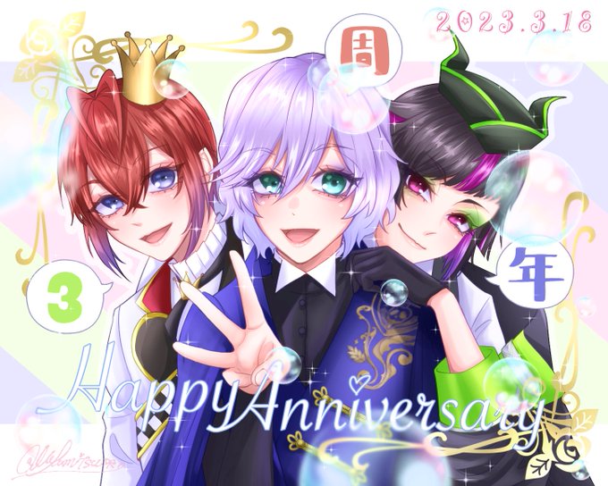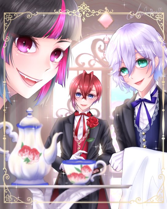 すんごい今更ですが、2周年記念に間に合わなかったイラストです…途中描くのやめようかと思ったけど、最後まで完成させたのでよかったら見てください…!!! 改めまして、ツイステ2周年おめでとうございました!!🎉🎉✨ #ツイステ2周年 #twstファンアート #ツイステファンアート #リボン組 🍎 🌹 🦇