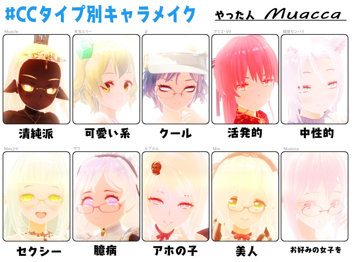 #カスタムキャスト #CCタイプ別キャラメイク 雛形萌路さんが面白そうなことをやってらっしゃたのでウチの子たちの過去絵で作ってみました! 同系統(年齢違い、性別違い、オルタ)は除外、コラボ系キャラも除外するとだいたいこのメンバかなと。