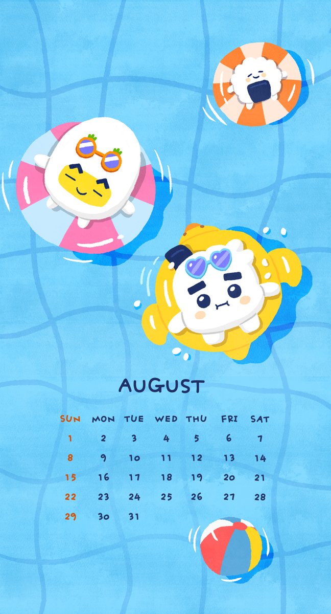 시원한 8월 배경화면이 도착했어요. 주먹밥쿠와 함께 휴대폰 배경화면을 꾸며보세요. #august #calender #배경화면 #wallpaper #주먹밥쿠 #RICEBALLKU #KUYA #netmarble