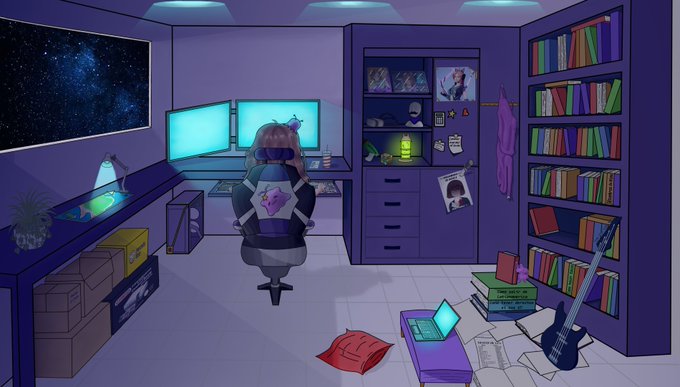 Empecé solo dibujando a @Emikukis y termine creando un fondo de pantalla personal jajja tiene muchos easter eggs como a @kendomurft y @KarmaVT_ , si alguien tiene mas ideas de que Vtubers poner lo are para el siguiente dibujo que haga #Emikukisart , #KendoArt , #karmavtart