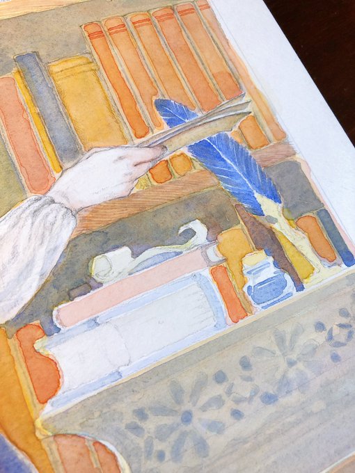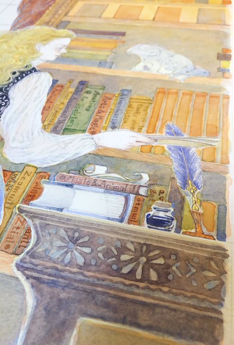 なんか 夏休みの宿題的な… 何でまた本棚のシーンを描いちゃったんだろうw (答え:本棚とか図書館が好きだから) #wip #水彩イラスト #社会人絵師活動応援フェス 明日も仕事終わったら描く! ᕦ(ò_óˇ)ᕤがむばる