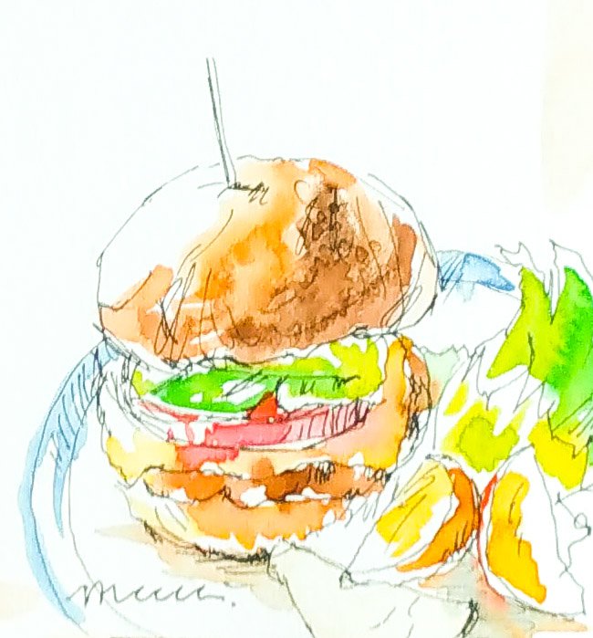 大阪中崎町の ハンバーガーショップ🍔 ここ美味かったっすよ〜 絵手紙に書いちゃいましたもん😅 #ハンバーガー #絵手紙 #水彩画