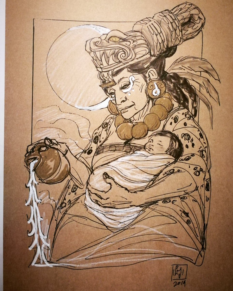 Inktober 28 - Ixchel, Mayan goddess of medicine and midwifery #inktober #inktober2019 #goddess #ixchel #mayan #medicine #midwifery #inkdrawing #ink