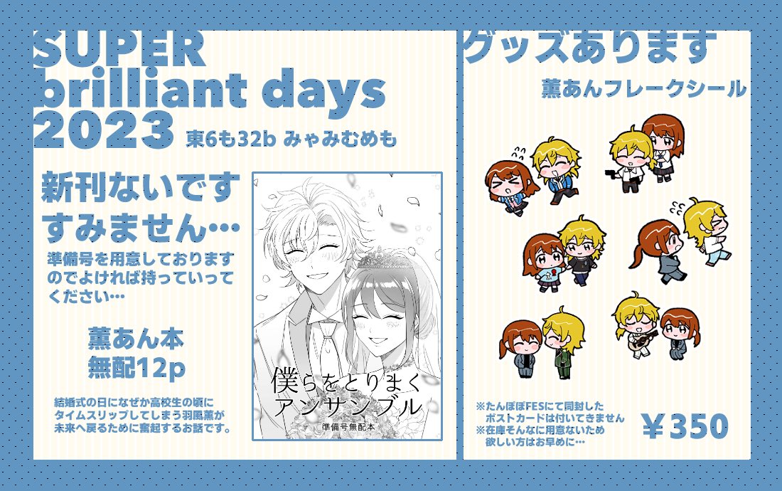 【お品書き】 5/3 SUPER brilliant days 2023 東6も32b みゃみむめも 新刊なくて本当にすみません🥲 薫あん本の準備号(無配)と 薫あんシールのみ持っていきます! よろしくお願いします🙇♀️
