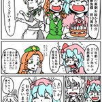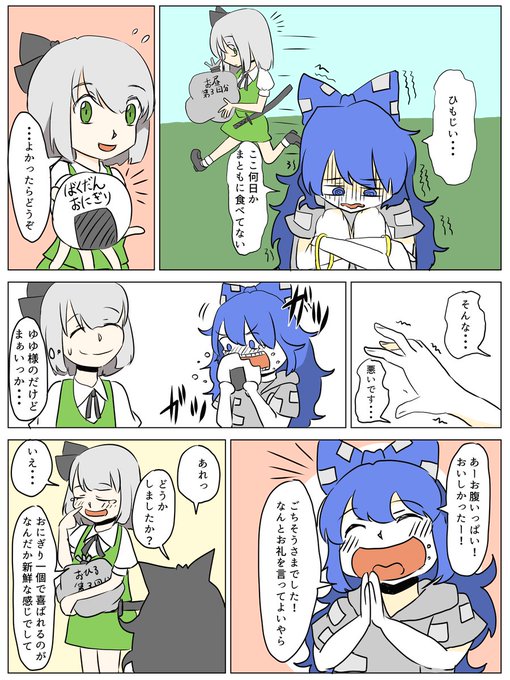 大遅刻 13日お題 +20分ときたもんだ 折角描いたから載せるぜ オラッ ゆゆ様は偉大なお方なので人助けの為に自分の分け前を部下が人にあげて怒る人ではありません 妖夢がそれがわかってるからこんなこと出来るんです もちろん後半不覚にも涙を流したことは報告していません #東方の90分お絵描き