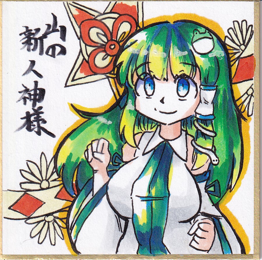 東風谷早苗さん描きました 胸が大きいっていうのは性癖とかじゃなくて早苗さんはそう描かないといけないという言い伝えがあるからなんだ 背景寂しいので謎の和柄も入れました 一人描くと三人そろえたくなるね・・ 自分で作ってコンプリートしていく 謎のトレーディングカード要素 #東方Project