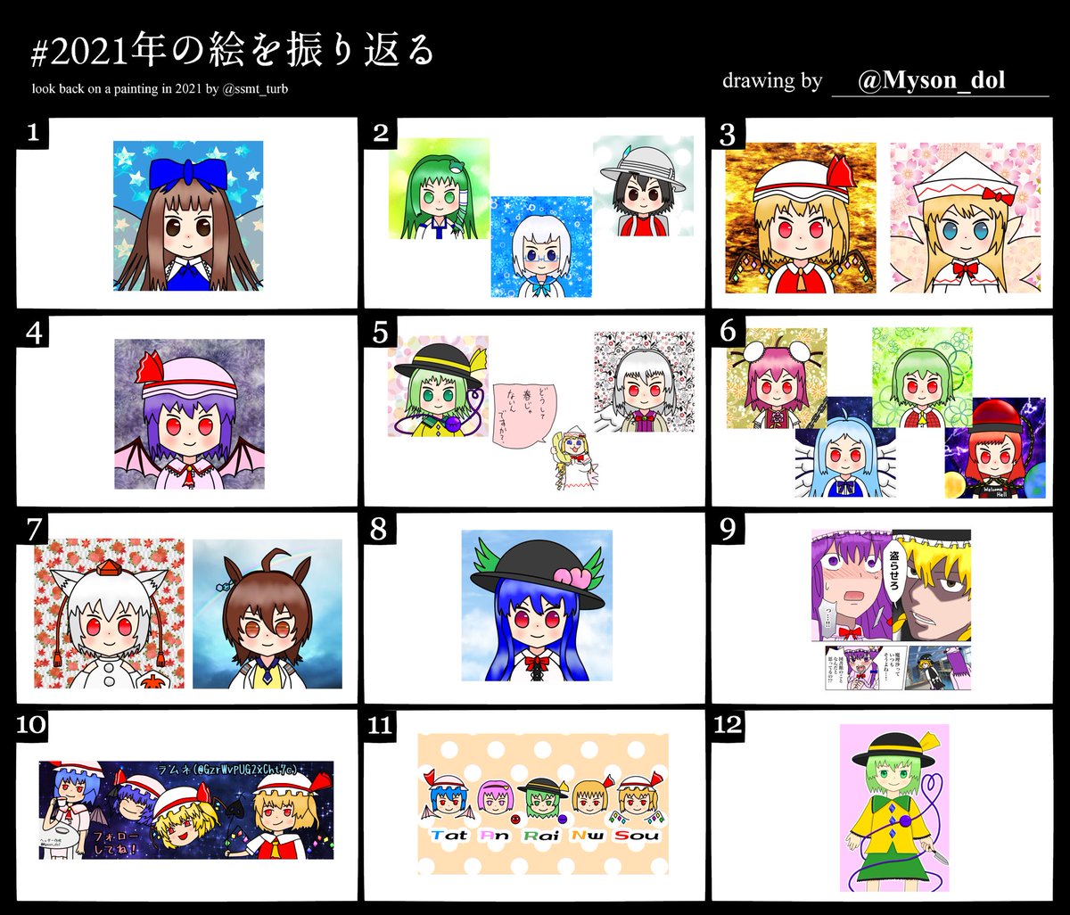 フォロワーの為に描いた絵(アイコン、ヘッダー等)も含んでいる。 公開した月ではなく描き終わった月に合わせている。 下半期はサボってたと思ってたけど、意外にも描いてない月はなかった。 #2021年の絵を振り返る #今年描いた絵を晒そう