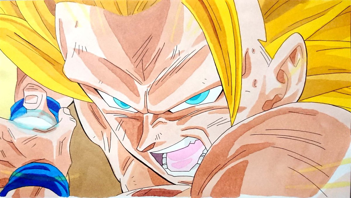 100均コピックで超3悟空さん描きました! 初めてフルでマーカー使用、初めてのDBイラストであります #ドラゴンボール #孫悟空 #DragonBall #コピック #模写 #絵描きさんと繋がりたい