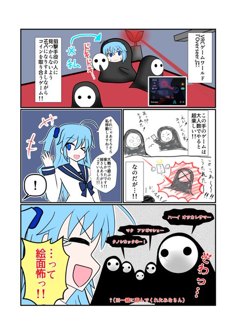 【#VRC漫画 】 みなさんは「Overseer」というゲームワールドをご存知でしょうか? Questでも遊べるワールドで『オバケのようなNPCと同じ姿になって、狙撃手役の人にバレないようコインを取り合うゲーム』です!✨ 大人数でやると超楽しいですよ!! #VRChat #VRChat_world紹介