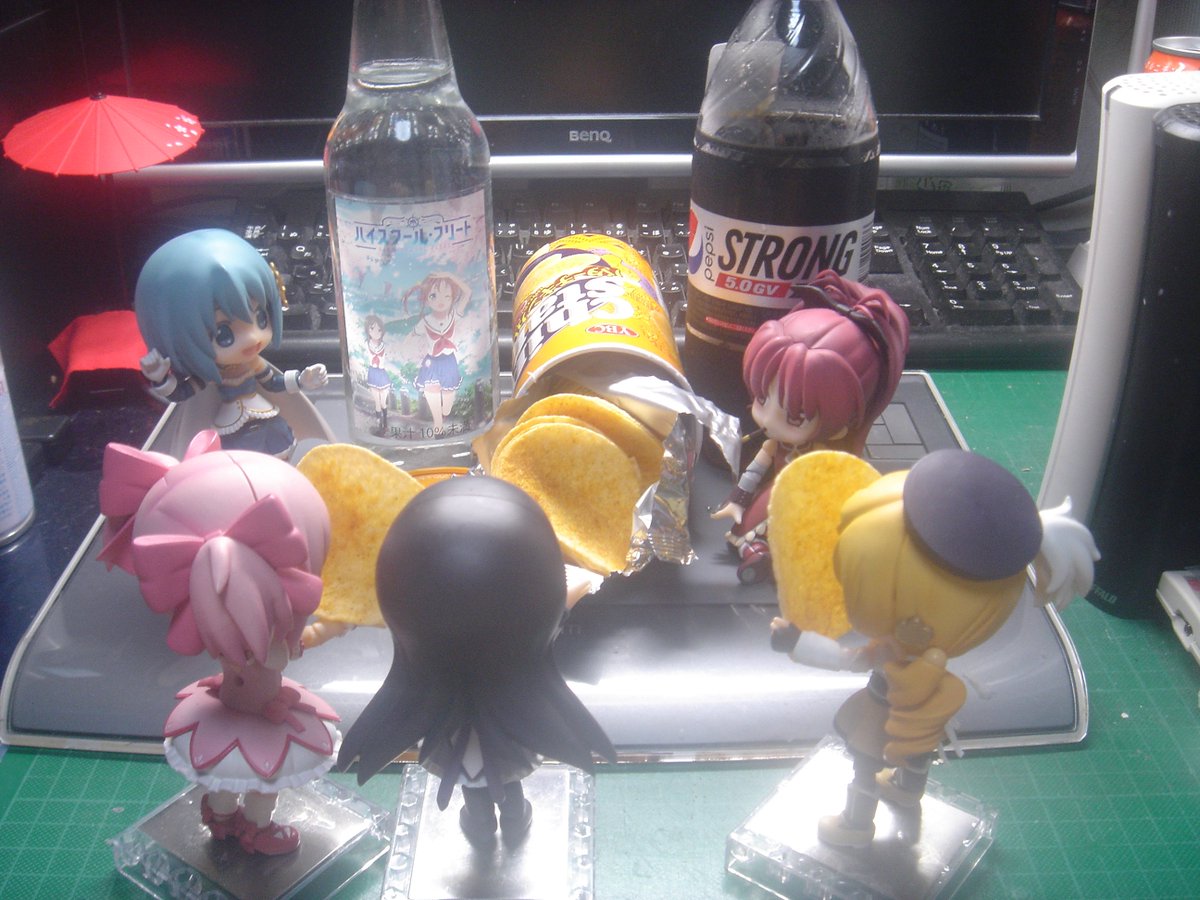 ただ今、まどマギ達の宴会中。その1 さやか「私もお菓子食べる~!」 杏子 「私とのじゃんけんに勝ったらな」 マミ 「この色、そう、私のイメージカラー!」 #キューポッシュ