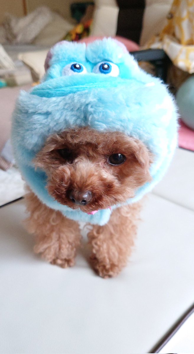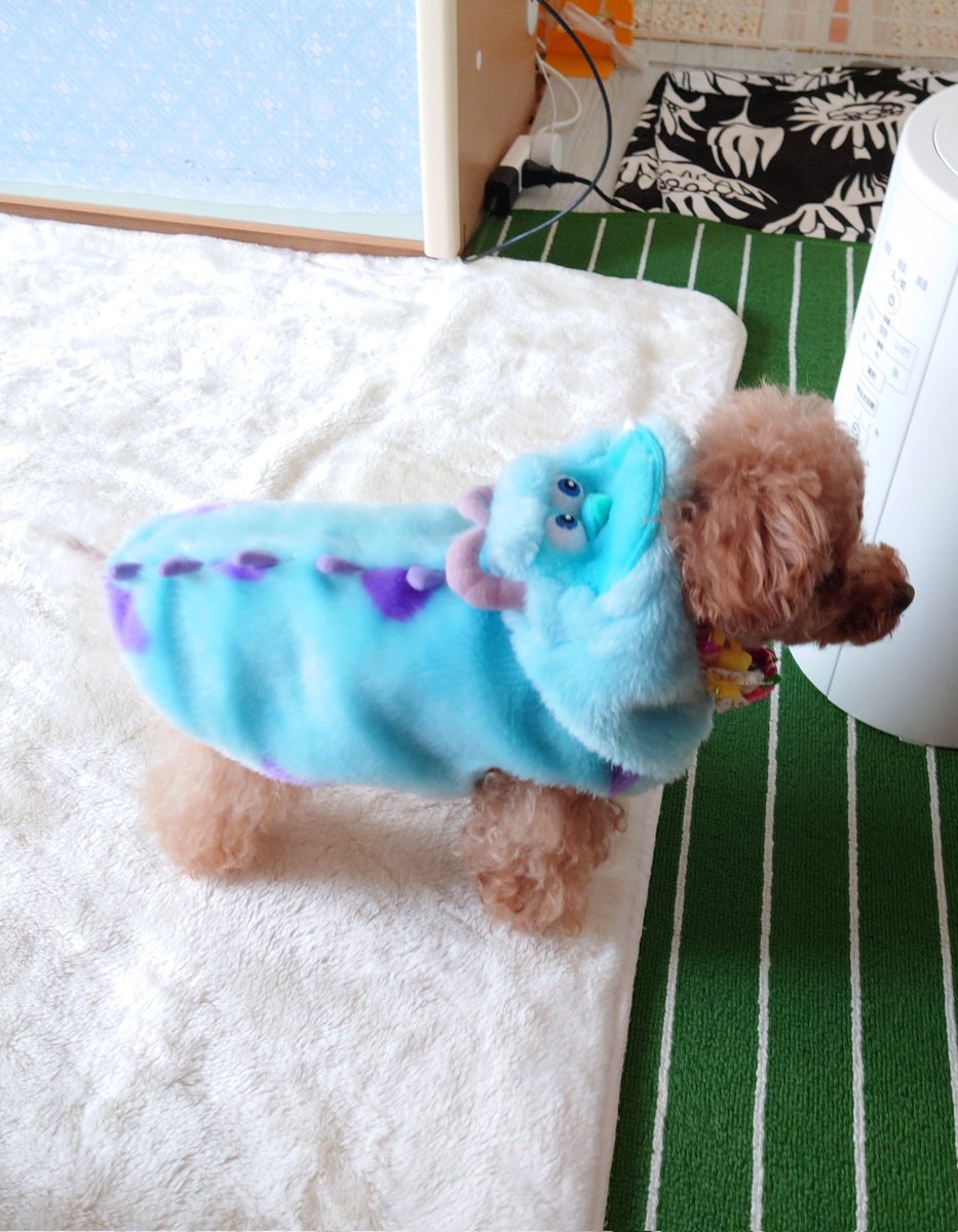 今日のお散歩着はモンスターズインクのサリーです👻 服というよりコスプレだな… #トイプードル #コスプレ