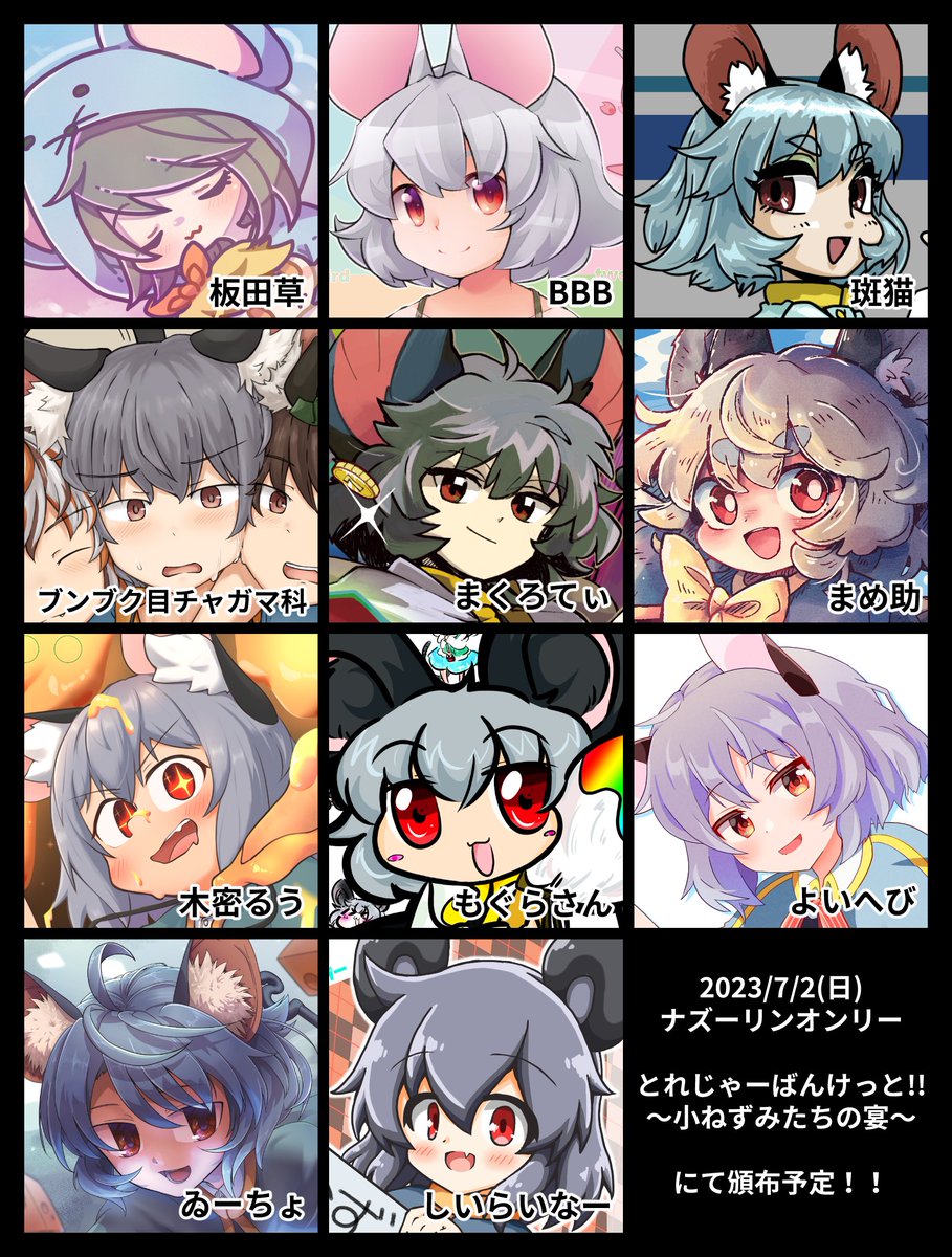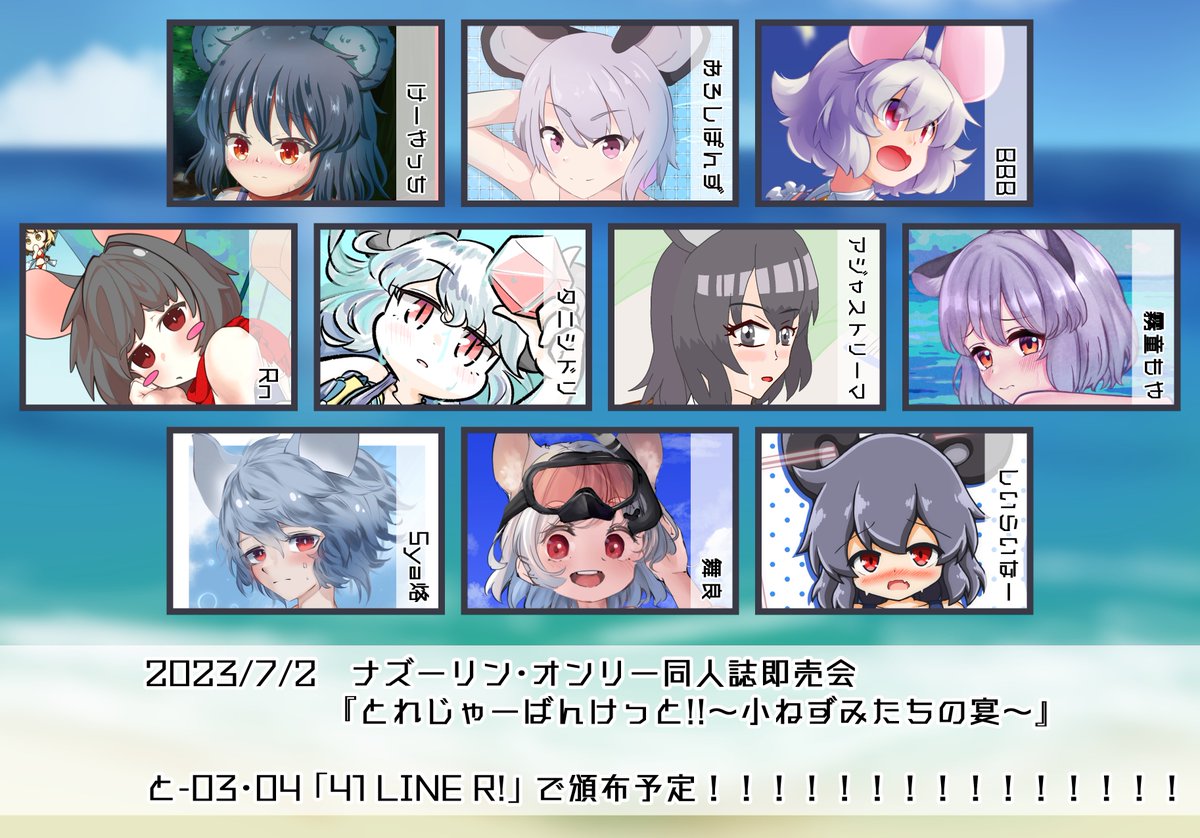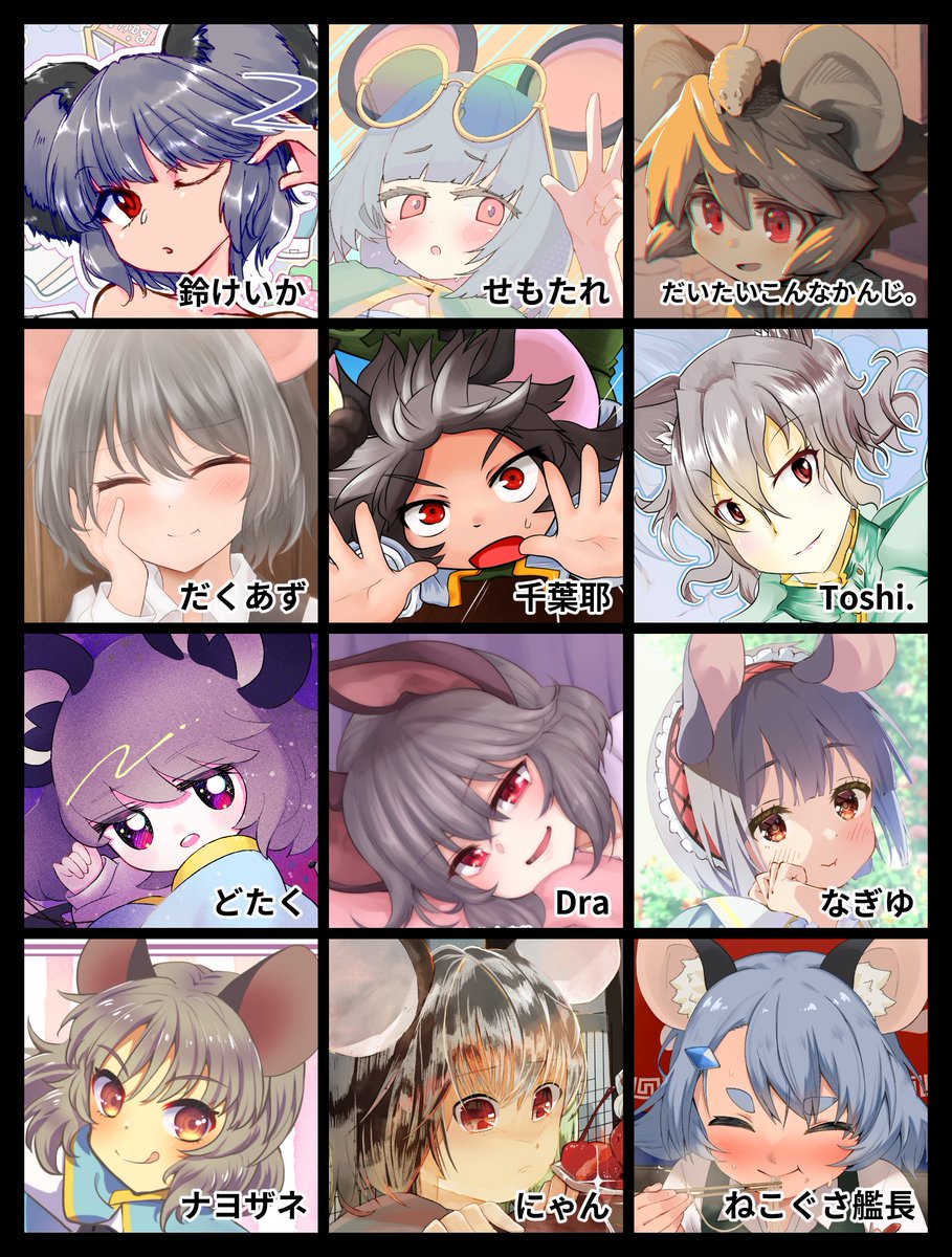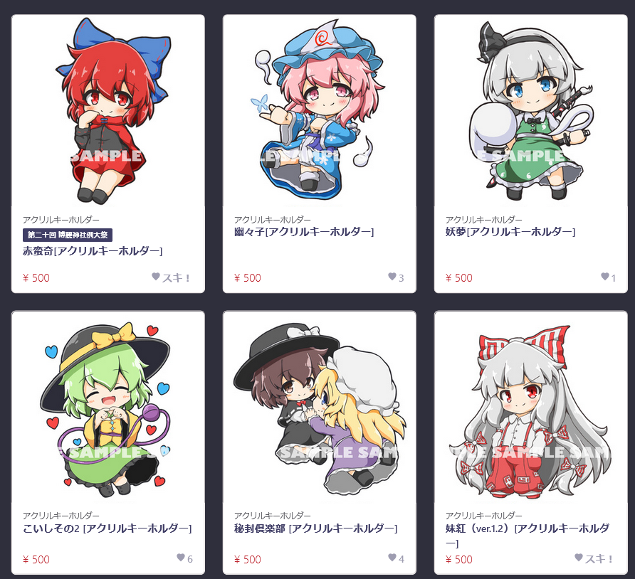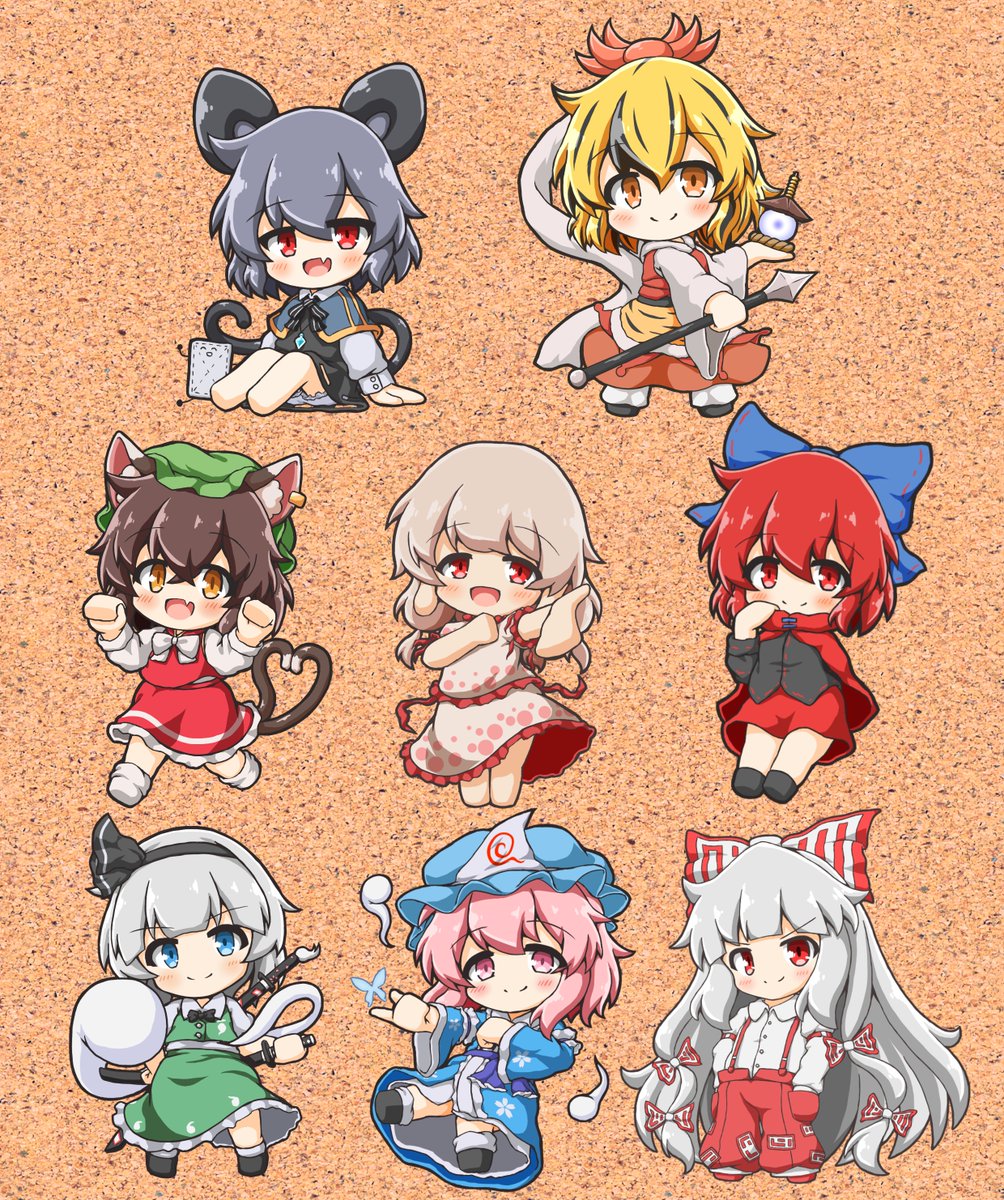 新作(準新作含む)ちびキャラアクキーが8種類でます!! イベント終了後BOOTHでも頒布予定です。 ◆ナズーリン(智霊奇伝) ◇寅丸星 ◆橙 ◇戎瓔花 ◆赤蛮奇 ◇魂魄妖夢 ◆西行寺幽々子 ◇藤原妹紅(ver.3) twitter.com/NDliner41/stat…