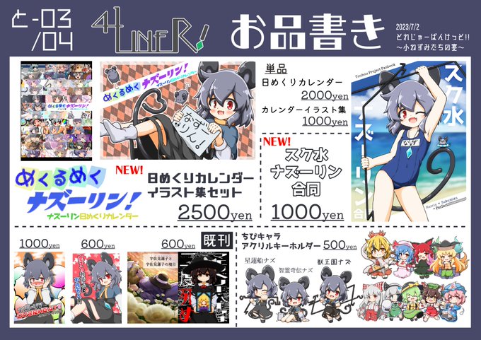 Boothの方更新完了しましたー! ナズーリンオンリーで出した新作カレンダー・合同誌2つに加えて、これまでの既刊本も大体並べました。 一部は今後のイベントでも持っていく予定ですが、興味がある方はぜひに! 41liner.booth.pm