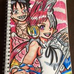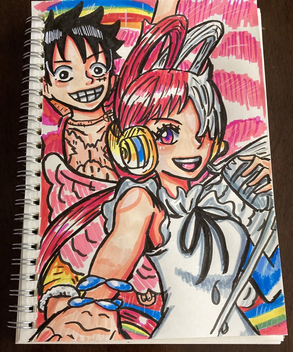 落書きのつもりがwww このコンビめっちゃ好き🎧👒 #ワンピース #ルフィ #ウタ #イラスト #一発描き