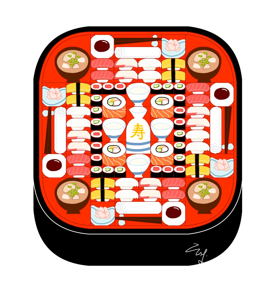 「Sushi Deck for Four People with Sake」 過去絵の再掲。そういえばこんなものも描いていました。升目状に配置して...みたいな。ディアブロ系ゲームのアイテムインベントリの概念、といえばわかる人には伝わるでしょうか。
