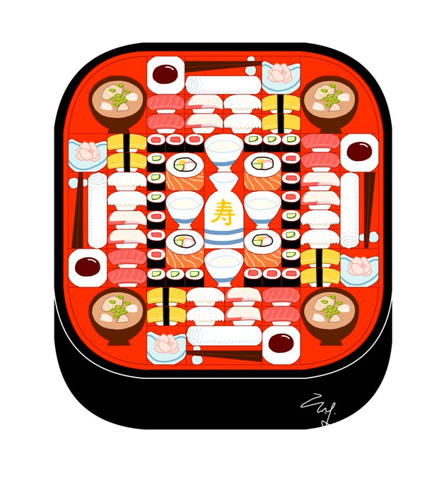 4 6 「Sushi Deck for Four People with Sake」 過去絵の再掲。そういえばこんなものも描いていました。升目状に配置して...みたいな。ディアブロ系ゲームのアイテムインベントリの概念、といえばわかる人には伝わるでしょうか。 22/09/15 03:01