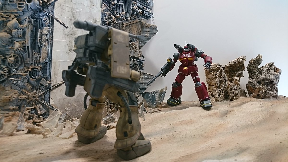 ロボットアニメーション酒場ROBOT KICHI(ロボキチ)の砂漠ジオラマでガンプラ撮影。 持ち込みガンプラ HG ガンキャノン(リアルタイプカラー) HG ザク・ハーフキャノン プラモで遊べてアニメ見れてお酒飲める!楽しい✨ #ロボ基地 #ロボキチ #もけんちゅTV #ガンプラ