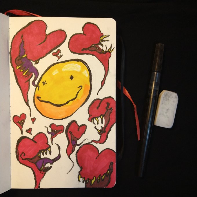 "The Despondent Desire to be Simple and Happy" #art #ventart #sketch #sketching #sketchbook #drawing #draw #marker #brush #painting #smile #hearts #horror #monster #inktober2022