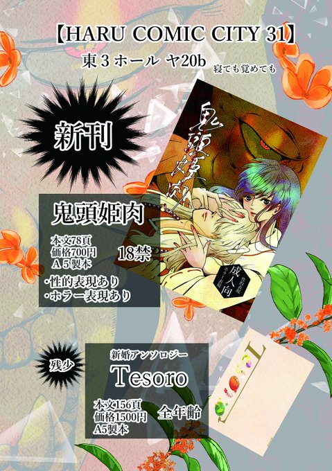 3/19 HARU COMIC CITY 31 スペース:東3ホール ヤ20b 【鬼頭姫肉】78頁700円 ジャンルはイチャラブシリアスハッピーホラーです!初めて聞くよね私もです! ⚠️Tesoroはほんと数冊です。 鬼頭姫肉のサンプルは繋げてるpixivページからご確認下さい🙇♀️