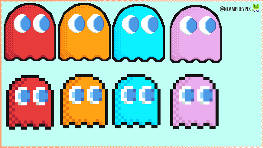 You like the Pac-Man Ghosts? I've made them four, in two variants: Normal sized, ideal for social media PFPs, and Twitch badge sized ones. #pixelart #ドット絵 If you liked this, you can help me by making a donation here: ko-fi.com/nlampreypix Available soon on my store!!!
