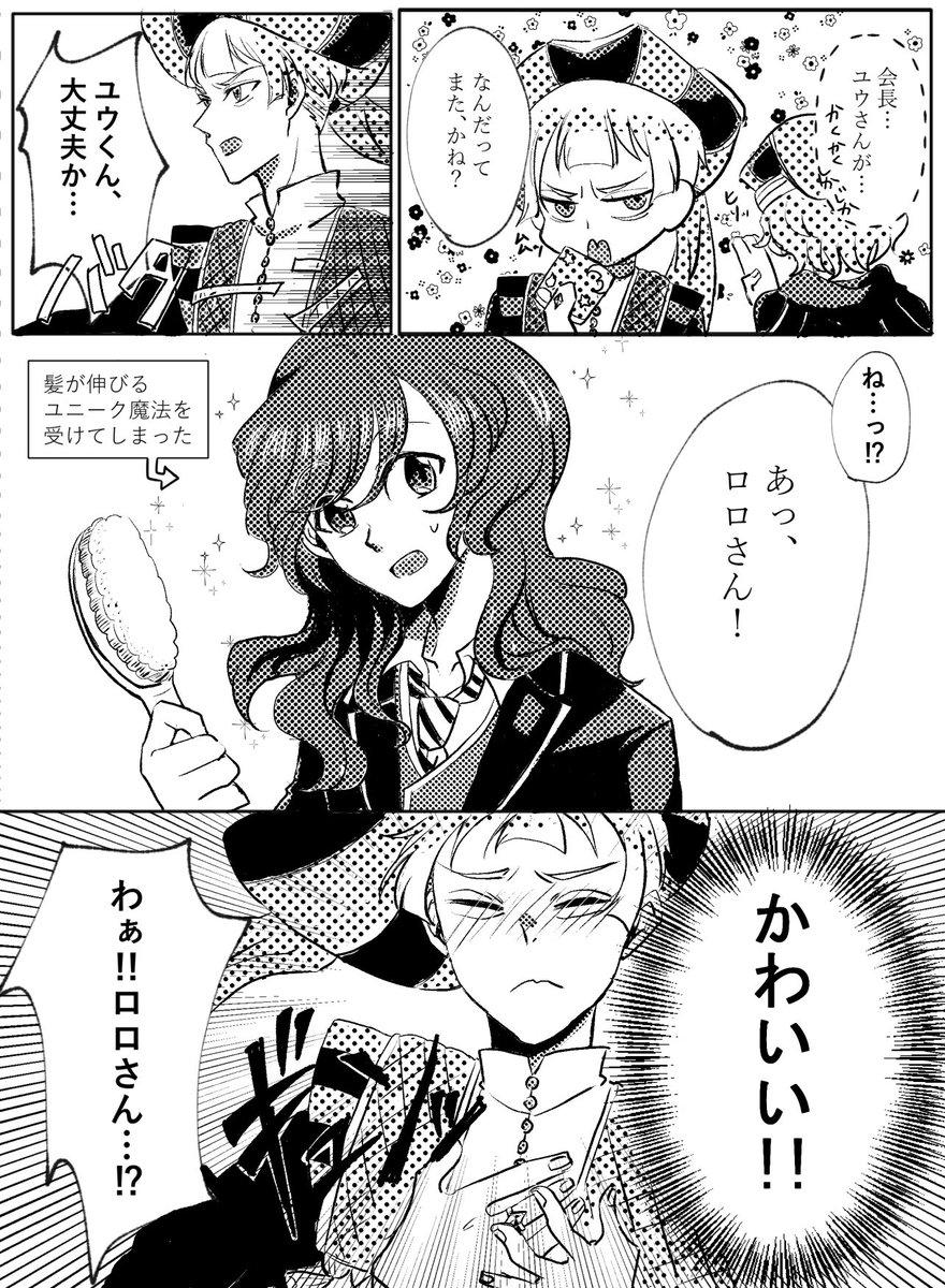 22 220 ユニ魔法を受けてしまった監督生を助けようと会いにいったら、自分のド好みでギュンってなるロロ監♀ ギャグチック ※付き合ってるロロ監♀ ※ロロのタイプの女性はふわふわロン毛というプチ捏造設定あります #twstプラス 22/12/18 21:59
