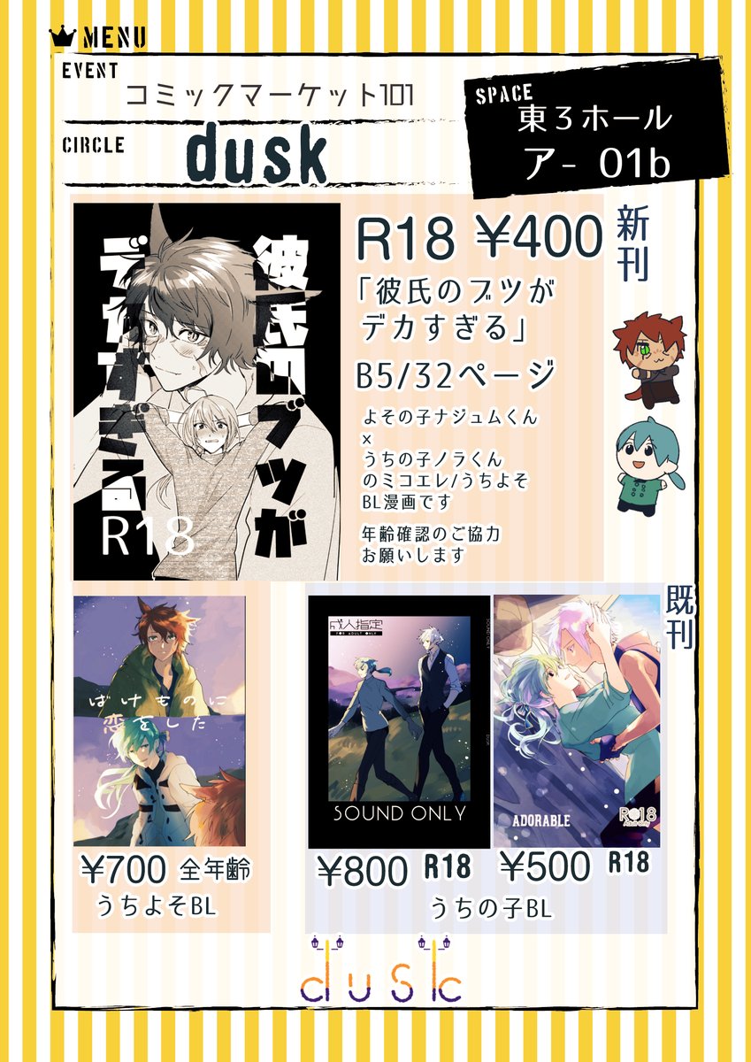 【頭割り3展示作品】ADORABLE | なるみ #pixiv pixiv.net/artworks/94118… 新刊?展示?できました!!全部読めます!!26pです。全年齢。BLです。うちうち(オクノラ)です