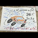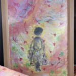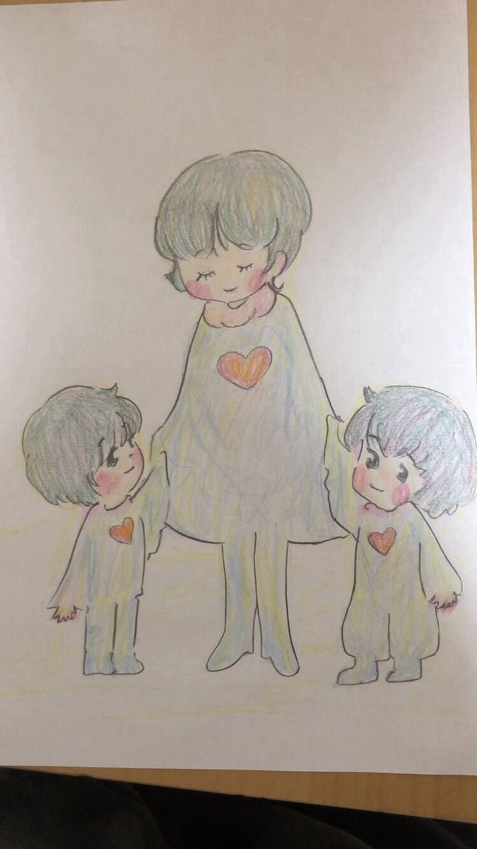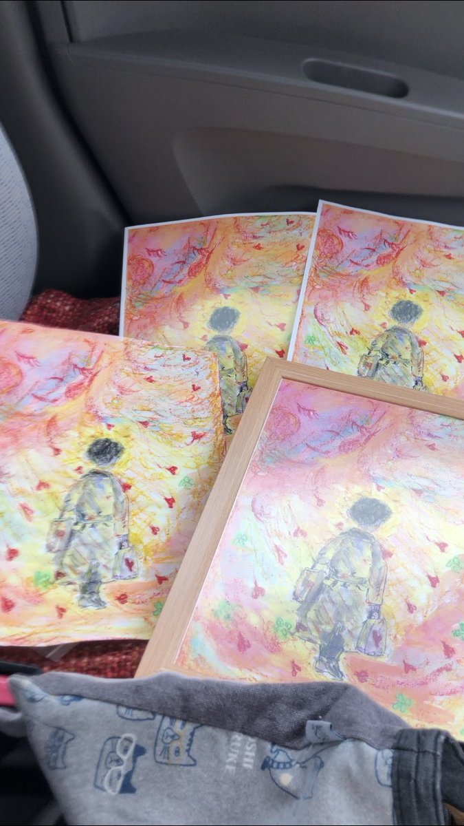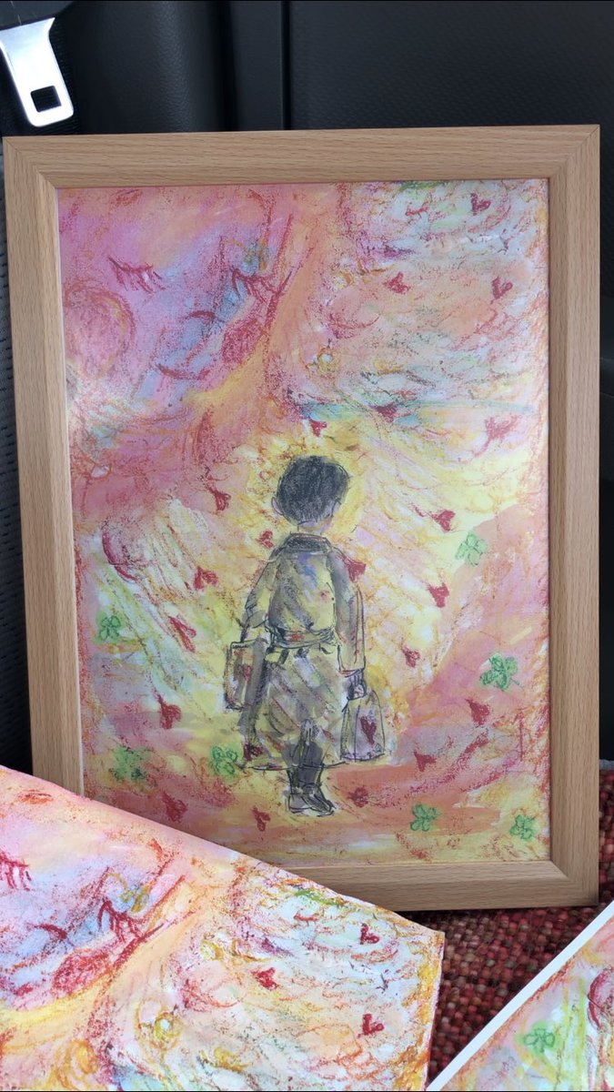😊 こっちの額にした︎💕︎︎ 原画は 廃棄コピー用紙に描いたから シワシワ😂 なので カラーコピー3種類から 選んだ😃︎💕︎︎ いい感じ(๑•̀ㅂ•́)و✧☀️✨ #頑張り続けた大先輩へ贈るイラスト