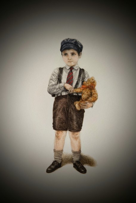 こんばんは。 テディベアを抱く男の子の絵を描きました✏️ #色鉛筆画 #絵描きさんと繋がりたい #少年 #テディベア